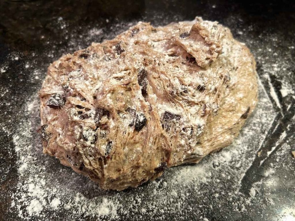 Inclusions: After kneading, add in your chopped cherries, pecans, and chocolate, and slowly combine them into the dough. This is a delicate dough, so don’t be surprised if you see some strings of gluten at this point.